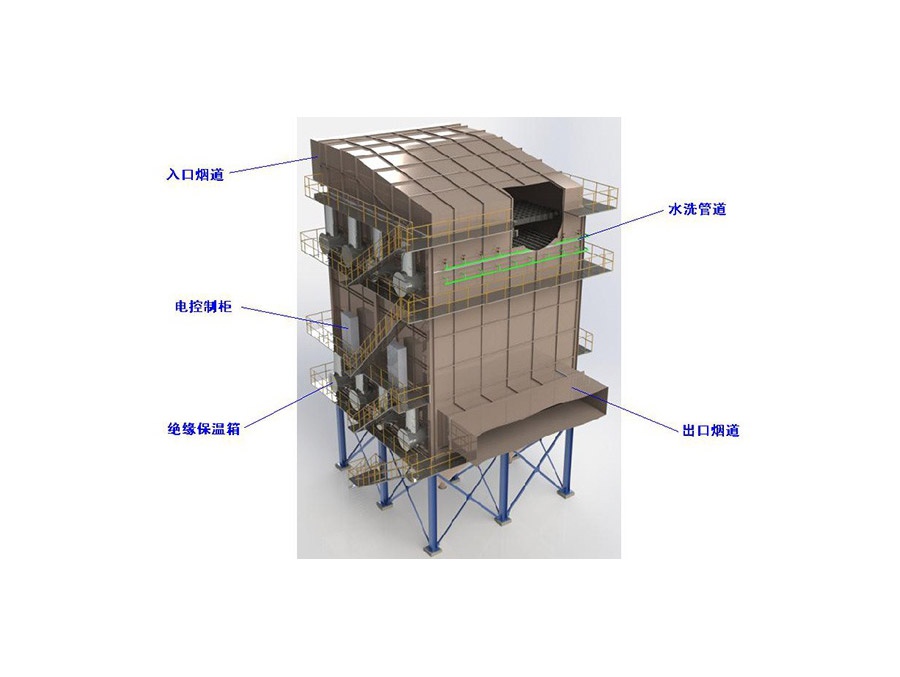 濕式電除塵器和與干式電除塵器的收塵原理相同,都是靠高壓電暈放電使得粉塵荷電,荷電后的粉塵在電場力的作用下到達到集塵板/管。濕式電除塵器主要處理含水較高乃至飽和的濕氣體。